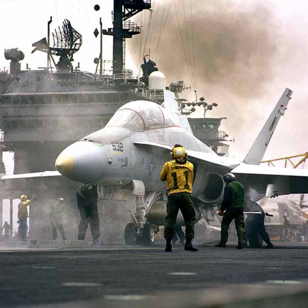 The flight deck of an aircraft carrier is a dangerous place. There is always a lot going on day and night when the ship is underway. Planes taking off and landing, aircraft being moved, cargo being loaded and unloaded, bombs and missiles being handled. There is jet fuel, ammunition, spinning propellers and rotors, howling jet engine intakes, and roaring exhaust and people, lots of people. It is loud almost beyond belief, and smells of fuel, hydraulic fluid, and exhaust. All of this is happening under the direction of the Air Boss, perched above the flight deck in a many-windowed tower. It is a well-oiled machine staffed by highly trained men and women. To those who know what is going on "flight ops" are thing of beauty. To the uninitiated it looks like chaos.